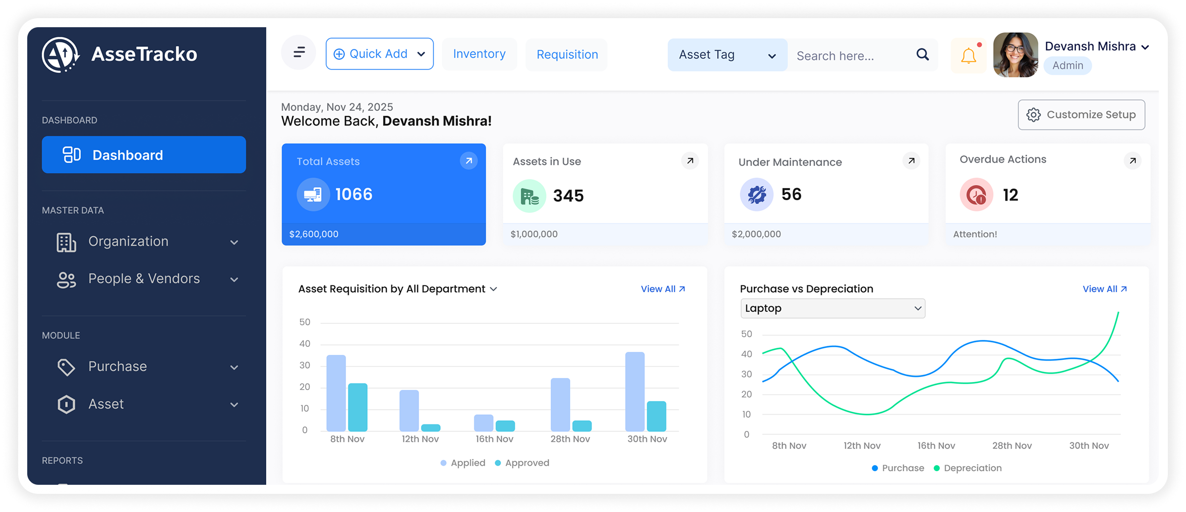 Built for growing organizations, it eliminates spreadsheet chaos, reduces downtime, and gives every stakeholder real-time visibility into the full asset lifecycle.